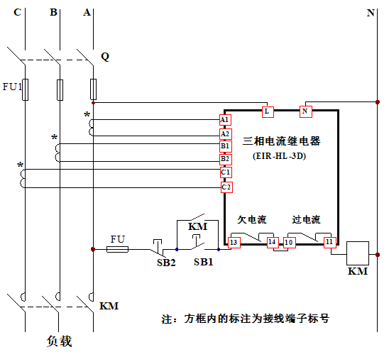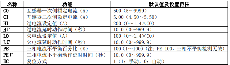 過電流、欠電流、三相不平衡保護,動作、復位延時可調,蜂鳴器報警,手動、自動復位可選