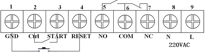 圖中2/3外接計(jì)時(shí)啟動(dòng)開關(guān)接通計(jì)時(shí),斷開停止計(jì)時(shí); 1/4復(fù)位按鈕接通計(jì)時(shí)值清零(僅在不設(shè)密碼時(shí)有效)。