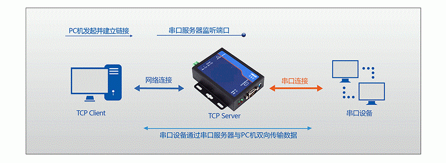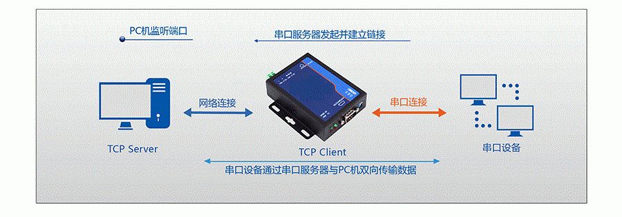 網(wǎng)關(guān)向設(shè)定的IP地址發(fā)起TCP鏈接,若鏈接失敗,網(wǎng)關(guān)將不斷嘗試重連直到成功。若鏈接成功,服務(wù)端就可以與串口設(shè)備雙向透明傳輸數(shù)據(jù)。