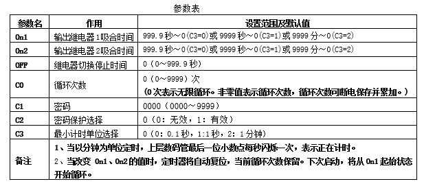 ◆繼電器輸出動(dòng)作按on-off-on循環(huán),循環(huán)周期為開、關(guān)時(shí)間之和。輸出繼電器開(on)、關(guān)(off)定時(shí)時(shí)間可通過面板按鈕分別設(shè)定。在開(on)計(jì)時(shí)段內(nèi),輸出繼電器保持吸合,在關(guān)(off)計(jì)時(shí)段內(nèi),輸出繼電器斷開。