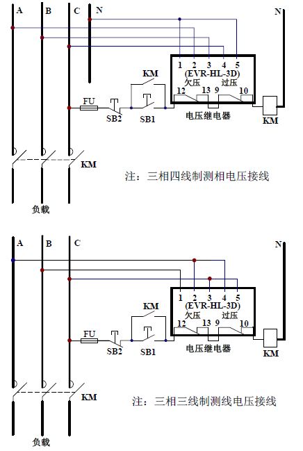三相數(shù)顯過電壓、欠電壓繼電器典型應(yīng)用如下圖所示,具有過電壓、欠電壓、缺相、相序和三相不平衡等檢測功能。圖中所用型號無需輔助工作電源,電壓測量范圍55~500V(如測量0~500V,需選配置輔助電源的型號),過電壓、欠電壓整定值及動作延時可通過繼電器面板設(shè)定,其輸出繼電器獨(dú)立控制,圖中過電壓、欠電壓觸點(diǎn)串聯(lián)使用,當(dāng)檢測到過電壓、欠電壓或失電時觸點(diǎn)斷開,接觸器線圈失電,斷開負(fù)載電源,從而保證負(fù)載電源的電壓始終在正常范圍內(nèi)。