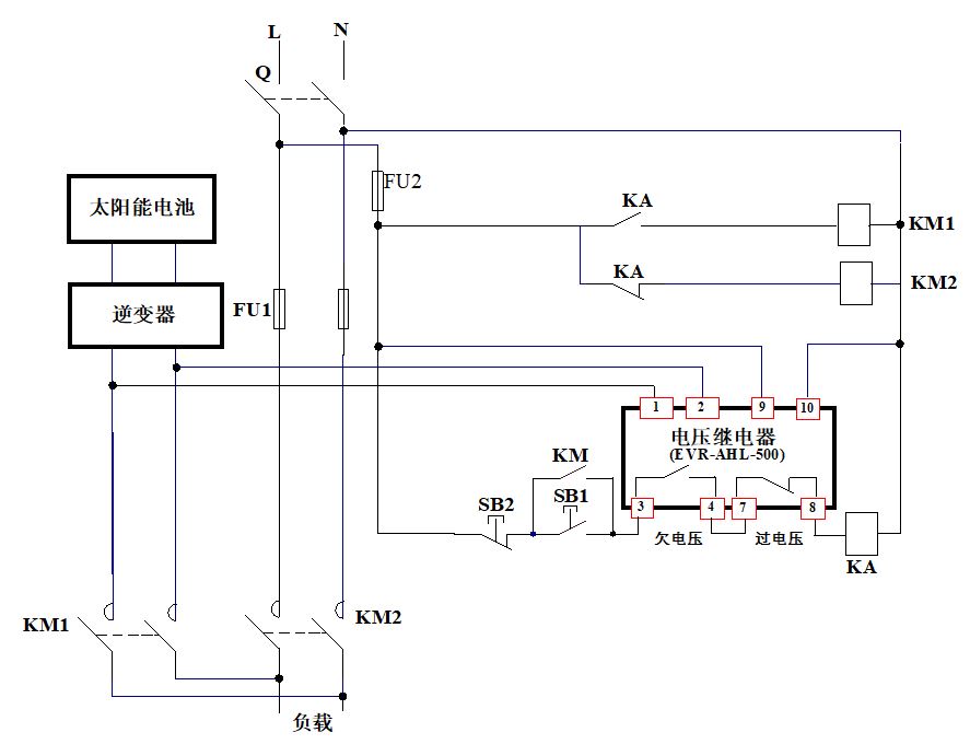 說明:在新能源應(yīng)用場景中,光伏太陽能電池如供電不足需切換到交流電網(wǎng)供電,利用本公司的過欠電壓繼電器檢測光伏裝置輸出的電壓,判斷其電壓是否正常,自動(dòng)控制光伏電池和電網(wǎng)切換供電,電壓繼電器(EVR-AHL-500)的1/2端檢測逆變器輸出的交流電壓,其過電壓、欠電壓參數(shù)分別設(shè)置光伏供電的電壓范圍,如電壓超過設(shè)定值可切斷光伏供電,如光伏供電范圍為210~230V主要參數(shù)設(shè)置如下: