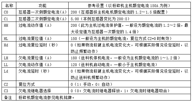 電流控制器參數(shù)設(shè)置實例:下表是電流控制器的參數(shù)表,如粉碎機(jī)電機(jī)的額定電流為150A,各參數(shù)的計算和設(shè)置可參考表中說明。